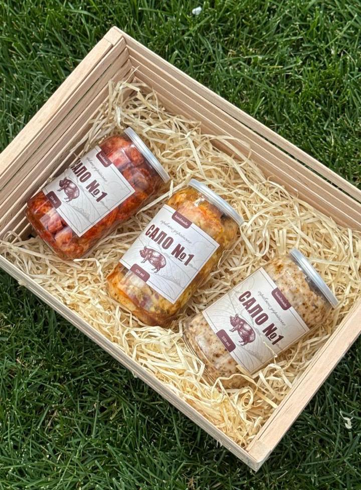 Внутрішнє оформлення доповнює святкову атмосферу, а розміри боксів підібрані так, щоб вмістити набори на 3, 6, 8 або 9 баночок сала, якщо ви оберете відповідну комплектацію.